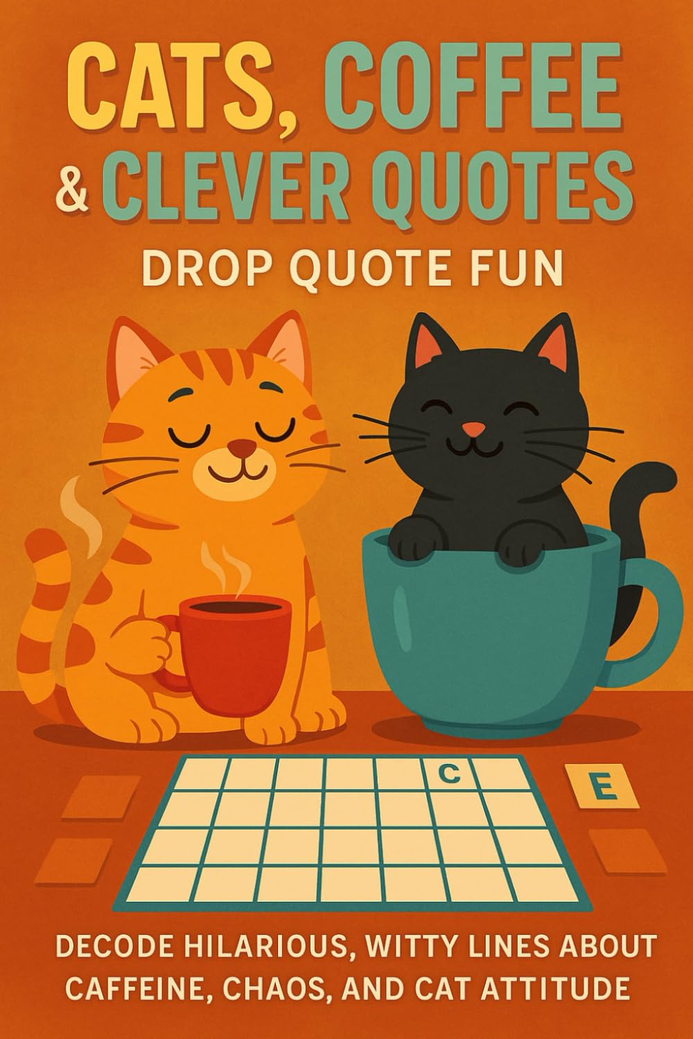 Cats, Coffee & Clever Quotes – Drop Quote Fun is the ultimate puzzle escape for anyone who loves caffeine, cats, and clever humor. This charming and funny puzzle book brings together brain-teasing Drop Quote challenges with witty, laugh-out-loud quotes inspired by coffee lovers and the hilarious chaos of living with cats.